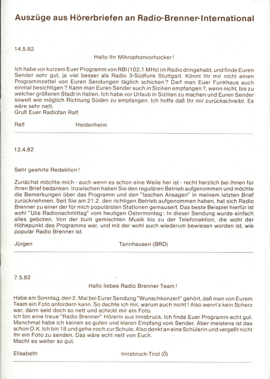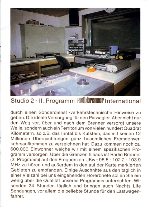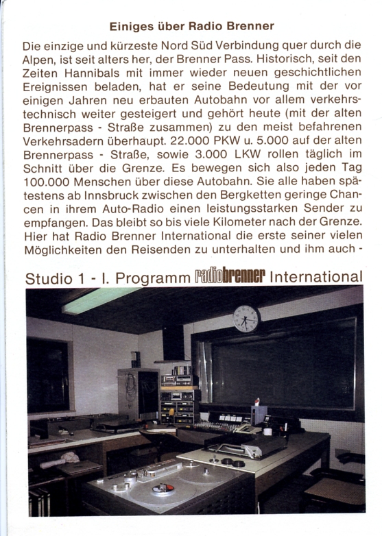 Radio Benner war immer mein Favorit und ich begeisterter Hörer. Als wir 1983 dann im Skilager in Sterzing waren, durfte natürlich ein Besuch beim "Radio Brenner" nicht fehlen. Davon hab ich als Erinnerung noch diese Broschüre: